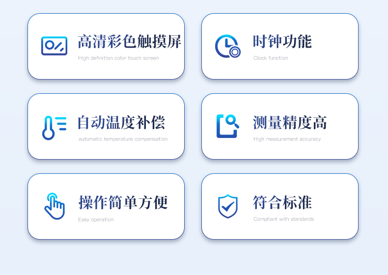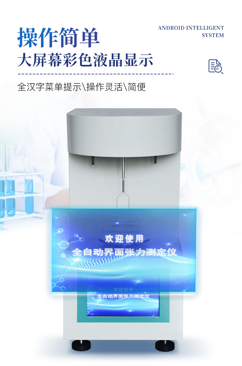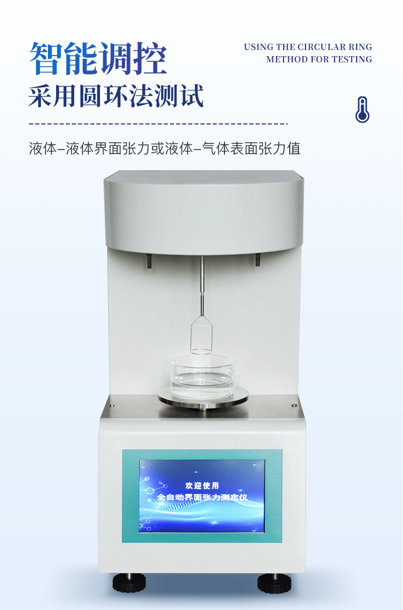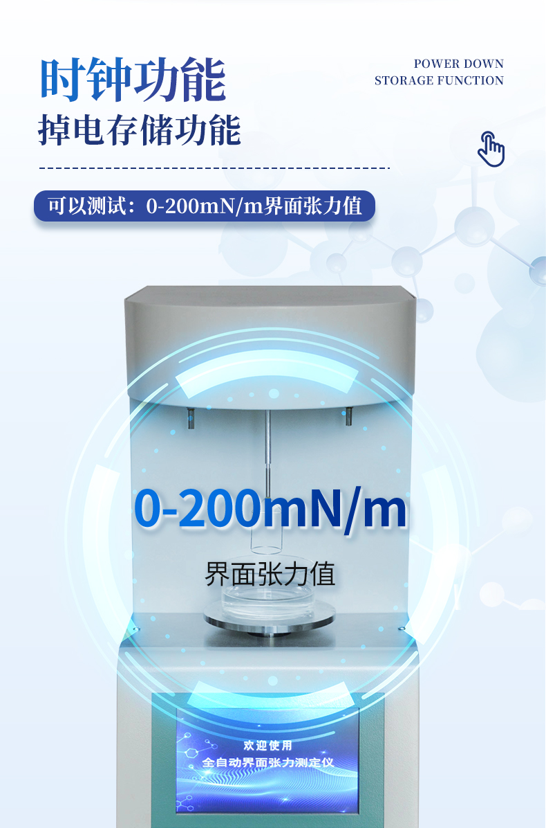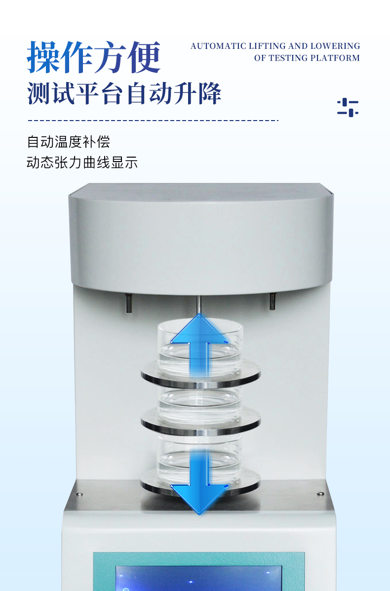 儀器采用等一點標定,簡單方便,保證測量精度;自動溫度補償;動態張力曲線顯示;時鐘功能,掉電存儲功能;高清晰彩色觸摸屏,操作更加方便;
