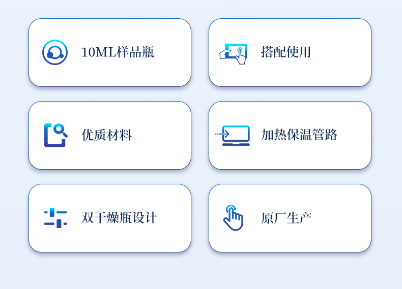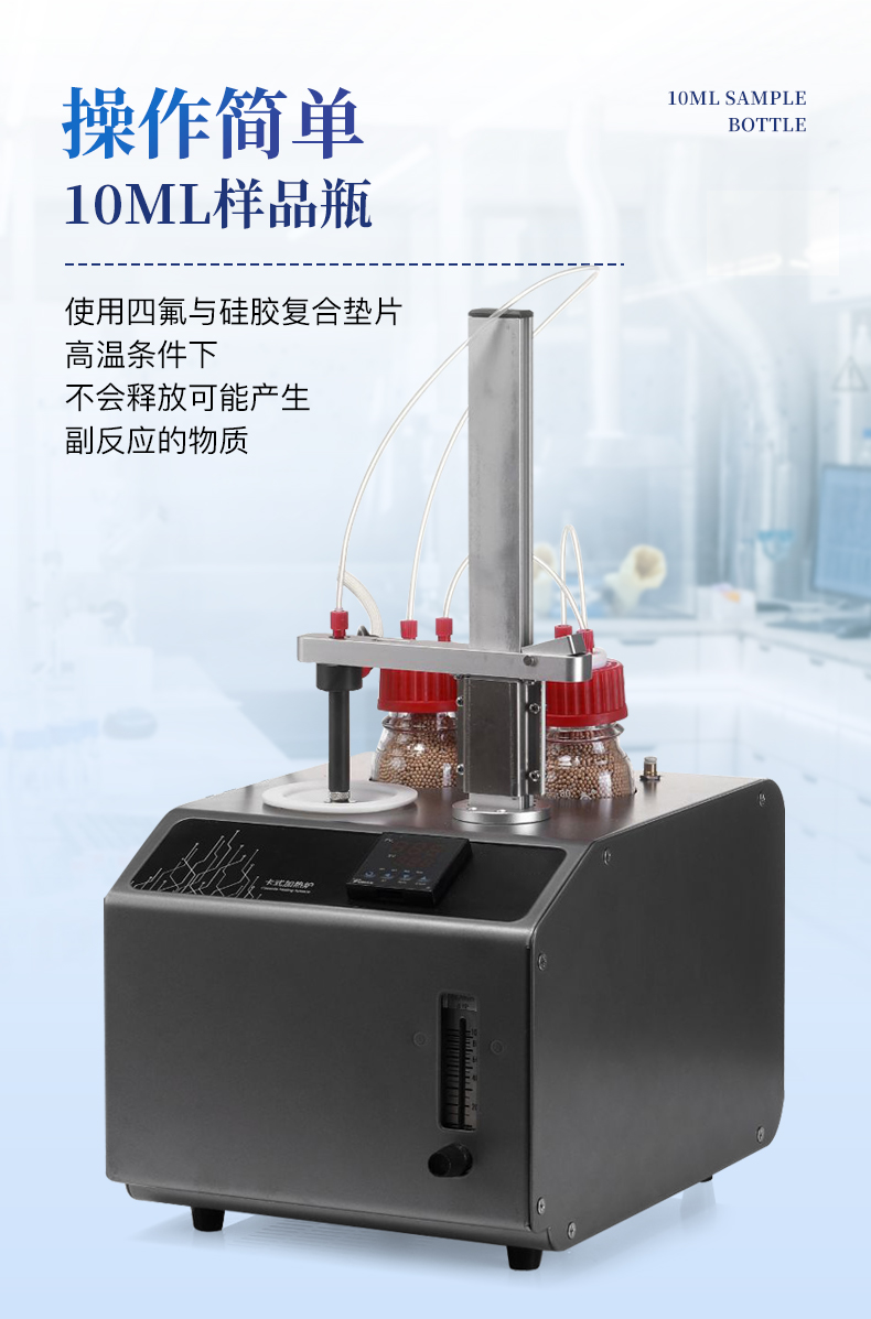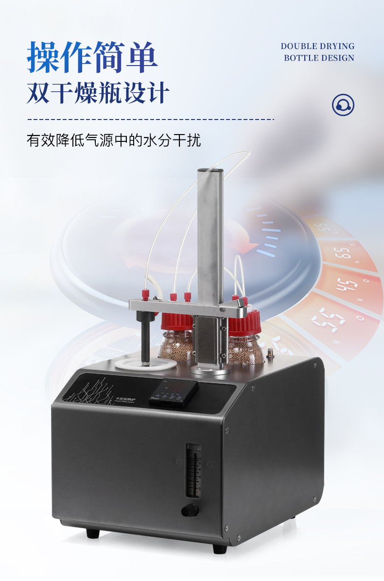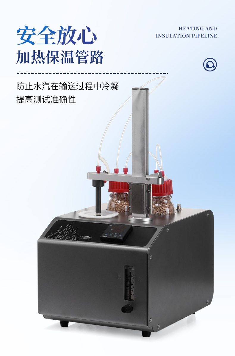 1、10ml樣品瓶:使用四氟與硅膠復合墊片,高溫條件下不會釋放可能產生副反應的物質2、雙干燥瓶設計,有效降低氣源中的水分干擾3、加熱保溫管路,防止水汽在輸送過程中冷凝,提高測試準確性