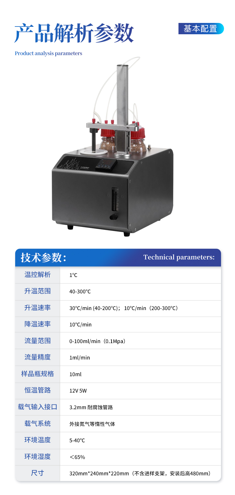 型號:YT-KSL溫控解析:1℃升溫范圍:40-300℃升溫速率:30℃/min (40-200℃); 10℃/min(200-300℃)降溫速率:10℃/min流量范圍:0-100ml/min(0.1Mpa)流量精度:1ml/min樣品瓶規格:10ml恒溫管路:12V 5W載氣輸入接口:3.2mm 耐腐蝕管路載氣系統:外接氮氣等惰性氣體環境溫度:5-40℃環境濕度:<65%尺寸:320mm*240mm*220mm(不含進樣支架,安裝后高480mm)