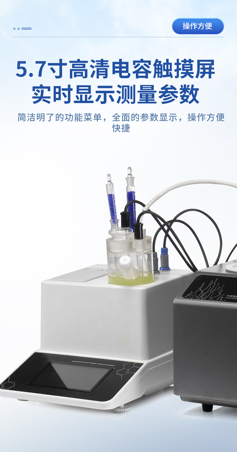 | 1. 采用高精度庫侖法水分測(cè)定儀與卡氏加熱爐聯(lián)用,**可以檢測(cè)到3μg水,精度達(dá)到ppm級(jí); | 2. 空芯氣針進(jìn)樣,和帶加熱功能的氣體輸送管路,零死體積水汽不凝結(jié),操作更簡(jiǎn)單,同時(shí)也很大的提高了儀器的準(zhǔn)確性和重復(fù)性; | 3. 5.7寸高清電容觸摸屏,實(shí)時(shí)顯示測(cè)量參數(shù),簡(jiǎn)潔明了的功能菜單,全面的參數(shù)顯示,操作方便快捷 ; | 4. 內(nèi)置5種方法可供選擇,8種計(jì)算公式方便各種樣品檢測(cè),自定義樣品單位%、ppm、mg/kg等結(jié)果單位更加人性化; | 5. 系統(tǒng)實(shí)時(shí)檢測(cè)環(huán)境中的水分,精準(zhǔn)扣除漂移,采用實(shí)時(shí)動(dòng)態(tài)阻抗法判定滴定終點(diǎn),測(cè)量結(jié)果更精準(zhǔn); | 6. **溫度300℃可以滿足大部分樣品檢測(cè),氣流0-100ml可調(diào),適合各種水分釋放速度的樣品; | 7. 操作方便,用戶只需要設(shè)置合適的溫度,合適的流量,把樣品放入事先準(zhǔn)備好的樣品瓶,放入加熱器,然后把傳輸針扎入樣品瓶的硅膠墊,在儀器上點(diǎn)開始測(cè)量即可; | 8. 無需等待上一次樣品瓶冷卻之后才能進(jìn)行下一次樣品測(cè)量,更換樣品瓶過程中樣品瓶始終保持密封狀態(tài),測(cè)量效率更高更準(zhǔn)確,尤其是吸濕性強(qiáng)的樣品無需擔(dān)心空氣中水分的干擾; | 9. 采用頂空進(jìn)樣的方式,保證每個(gè)測(cè)定采用“新”的樣品瓶,樣品測(cè)定無交叉感染。樣品瓶體積小,確保較小的死體積和背景水分值。獨(dú)立密閉樣品瓶,測(cè)定時(shí)無需樣品轉(zhuǎn)移,結(jié)果更準(zhǔn)確; | 10. 旋蓋式樣品瓶,無需專用且昂貴的壓蓋器和開蓋器,使用非常方便; | 11. 頂空進(jìn)樣技術(shù),只有氣體進(jìn)入水分測(cè)定儀反應(yīng)杯,不污染反應(yīng)杯及電解電極。 |