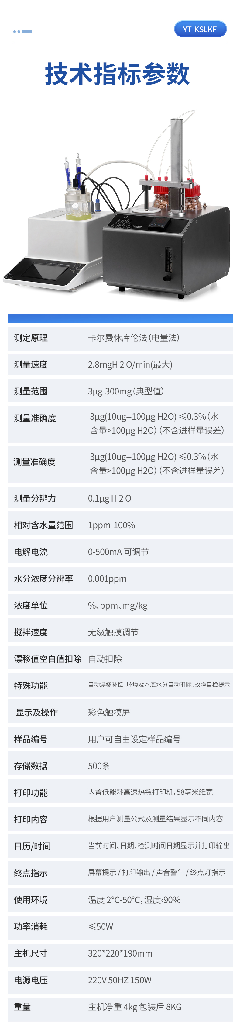 | 1. 測(cè)定原理:卡爾費(fèi)休庫倫法(電量法) | 2. 測(cè)量速度:2.8mgH 2 O/min(**) | 3. 測(cè)量范圍:3μg-300mg(典型值) | 4. 測(cè)量準(zhǔn)確度:3μg(10ug--100μg H2O) ≤0.3%(水含量>100μg H2O)(不含進(jìn)樣量誤差) | 5. 測(cè)量準(zhǔn)確度:3μg(10ug--100μg H2O) ≤0.3%(水含量>100μg H2O)(不含進(jìn)樣量誤差) | 6. 測(cè)量分辨力:0.1μg H 2 O | 7. 相對(duì)含水量范圍:1ppm-100% | 8. 電解電流:0-500mA 可調(diào)節(jié) | 9. 水分濃度分辨率:0.001ppm | 10. 濃度單位:%、ppm、mg/kg | 11. 攪拌速度:無級(jí)觸摸調(diào)節(jié) | 12. 漂移值空白值扣除:自動(dòng)扣除 | 13. 特殊功能:自動(dòng)漂移補(bǔ)償、環(huán)境及本底水分自動(dòng)扣除、故障自檢提示 | 14. 顯示及操作:彩色觸摸屏 | 15. 樣品編號(hào):用戶可自由設(shè)定樣品編號(hào) | 16. 存儲(chǔ)數(shù)據(jù):500條 | 17. 打印功能:內(nèi)置低能耗高速熱敏打印機(jī),58毫米紙寬 | 18. 打印內(nèi)容:根據(jù)用戶測(cè)量公式及測(cè)量結(jié)果顯示不同內(nèi)容 | 19. 日歷/時(shí)間:當(dāng)前時(shí)間、日期、檢測(cè)時(shí)間日期顯示并打印輸出 | 20. 終點(diǎn)指示:屏幕提示 / 打印輸出 / 聲音警告 / 終點(diǎn)燈指示 | 21. 使用環(huán)境:溫度 2℃-50℃,濕度?90% | 22. 功率消耗:≤50W | 23. 主機(jī)尺寸:320*220*190mm | 24. 電源電壓:220V 50HZ 150W | 25. 重量:主機(jī)凈重 4kg 包裝后 8KG | 26. 產(chǎn)品名稱:卡氏加熱爐 | 27. 溫控解析:1℃ | 28. 溫控解析:1℃ | 29. 升溫范圍:40-300℃ | 30. 升溫速率:30℃/min (40-200℃) 10℃/min(200-300℃) | 31. 降溫速率:10℃/min | 32. 流量范圍:0-100ml/min(0.1Mpa) | 33. 流量精度:1ml/min | 34. 樣品瓶規(guī)格:10ml(5ml、20ml 選配) | 35. 恒溫管路:12V 5W | 36. 載氣輸入接口:3.2mm 耐腐蝕管路 | 37. 載氣系統(tǒng):外接氣源 | 38. 環(huán)境溫度:5-40 攝氏度 | 39. 環(huán)境濕度:<65%,濕度越干燥儀器越穩(wěn)定 | 40. 主機(jī)尺寸:320mm*240mm*220mm(不含進(jìn)樣支架,安裝后高480mm) |