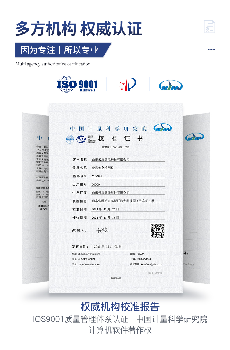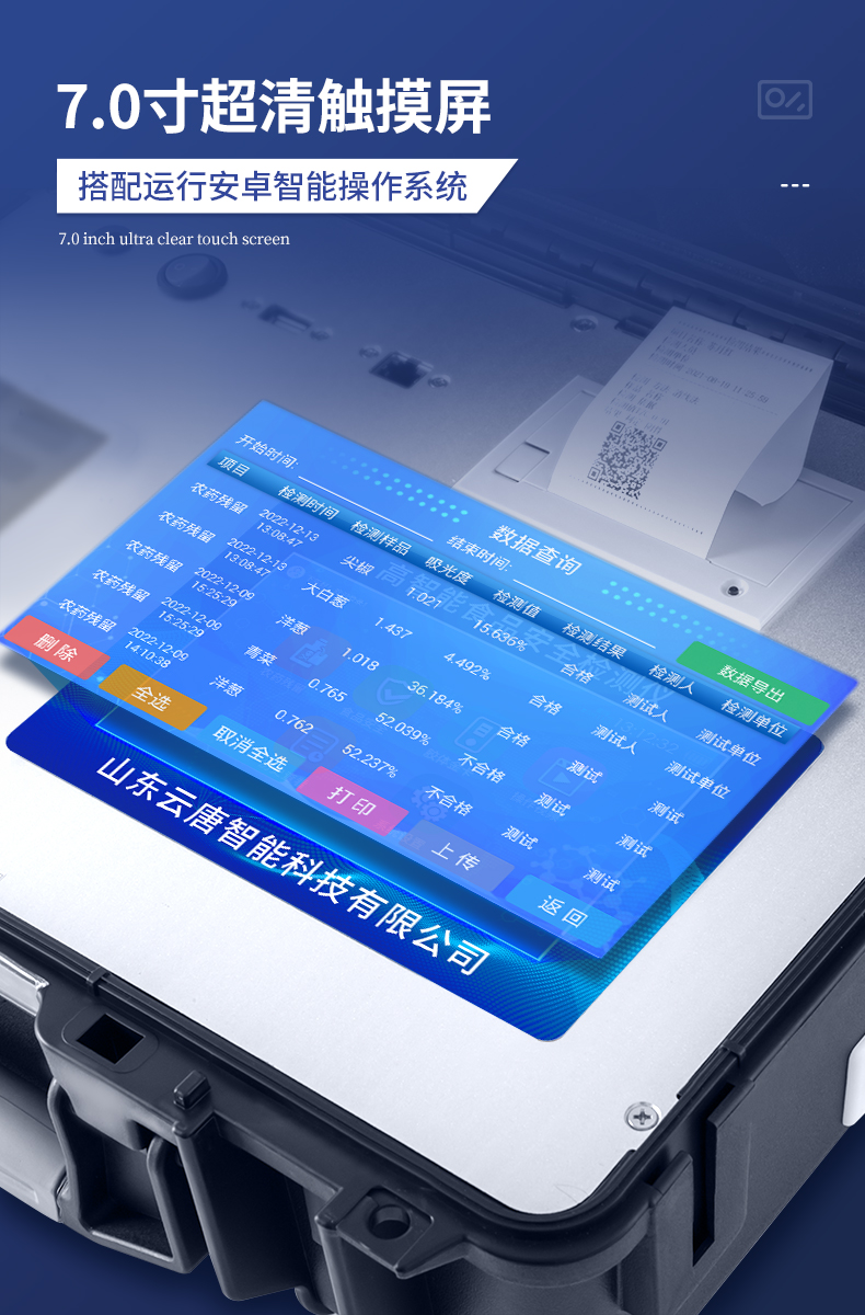 | 該儀器通過光電子技術對反應生成物的反射率進行分析測試,定量或定性分析樣品中待測物的含量。 | 安卓智能操作系統,7英寸高靈敏真彩觸摸屏,更加**和人性化操作, | 儀器具有4G無線聯網、wifi聯網上傳、GPRS無線遠傳功能,快速上傳數據。 | 便攜式儀器,便于現場攜帶操作,主機重量不大于3kg。 | 具有可見光光源,可檢測可見光信號,檢測值0~30000。 | 具有常用打印機數據線接口,直接打印結果;配備USB接口,可連接網絡。 | 具有多個食品安全檢測項目,開放平臺,可以增減檢測項目。 | 檢測通道:12個檢測通道,可以同時測試多個樣品,每個樣品由程序控制分別獨立工作,不會互相干擾。 | 以模擬反射率的標準片為50%附近時為代表,精密度CV值≤0.8%。 | 供電電源:(220±22V)~50Hz±1Hz,供電電源電壓波動不應超過220V AC±10%。 | 內置打印機,實時打印檢測結果。內置大容量電池,便于現場執法檢測。 | 高靈敏度,高檢測精度,高重復性精度,掃描式高精度光學傳感器。 | 機身儲存上萬條檢測結果,也可以導出儲存。 | 開放端口,可連接監管平臺數據庫,界面有上傳操作。 |
