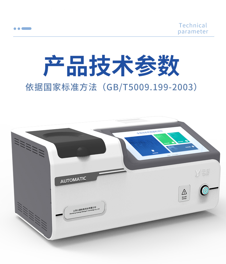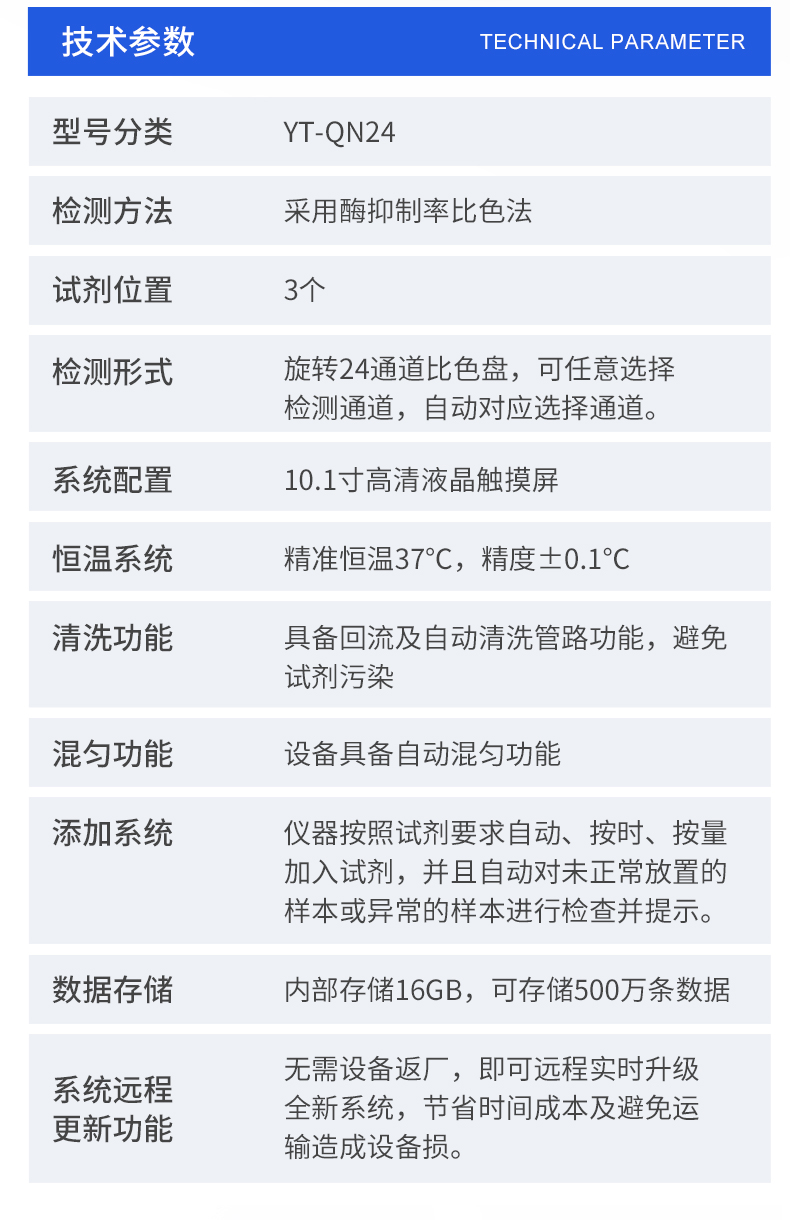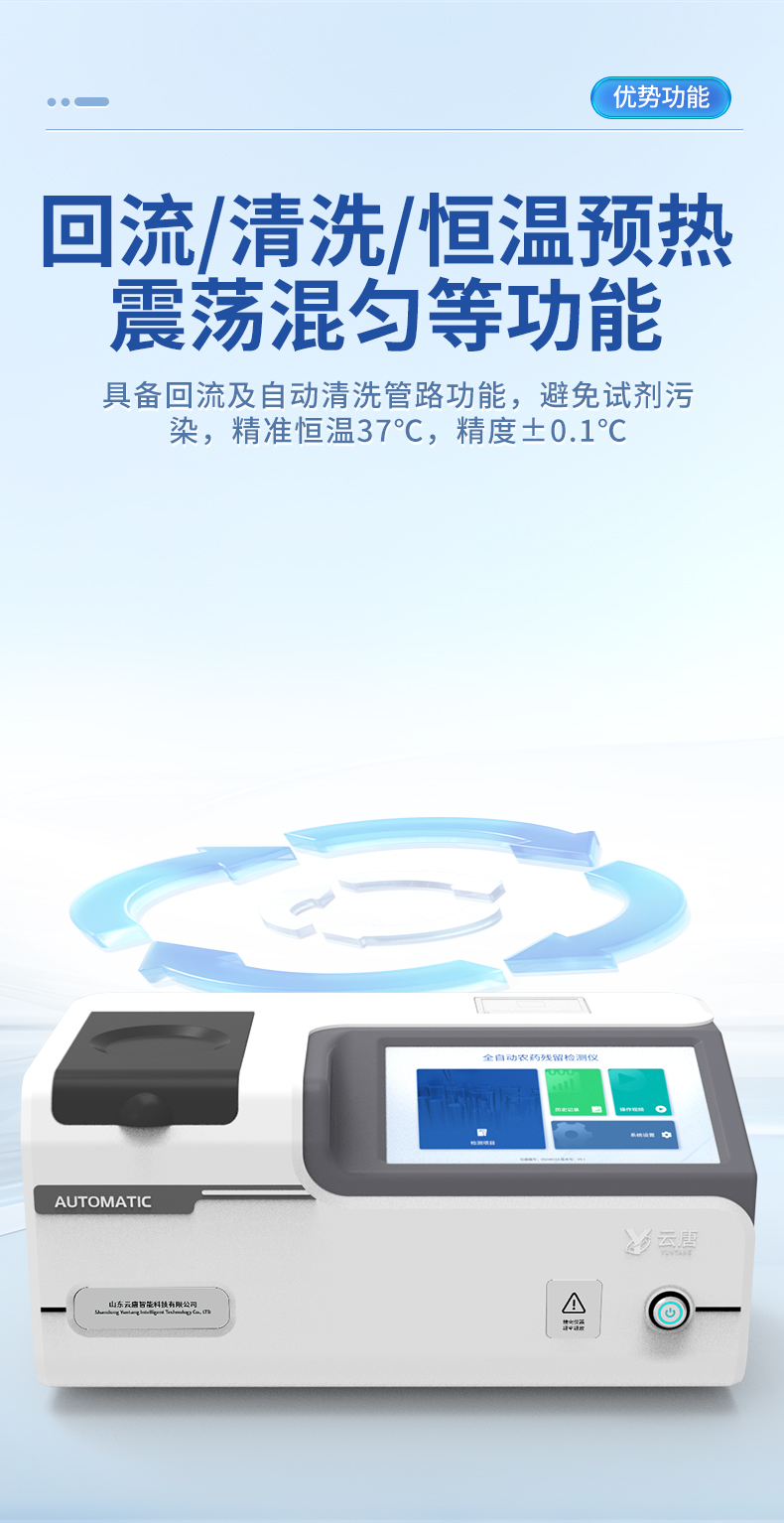 1. 試劑位置:3個2. 檢測形式:旋轉24通道比色盤,可任意選擇檢測通道,自動對應選擇通道。3. 系統配置:10.1寸高清液晶觸摸屏,采用ARM Cortex?-A7,RK3288/4核處理器,運行內存1GB。Android7.1.1 系統分辨率1280×800。4.恒溫系統:具有自動加溫溫控系統,精準恒溫37℃,精度±0.1℃。5.添加系統:儀器按照試劑要求自動、按時、按量加入試劑,并且自動對未正常放置的樣本或異常的樣本進行檢查并提示。 6.清洗功能:儀器具備回流及自動清洗管路功能,避免試劑污染。7.混勻功能:設備具備自動混勻功能。8.光源校準:設備可自動校準,確保檢測準確度。9.實時監控:儀器測試過程中屏幕顯示運行狀態,可實時查看。10.數據存儲:內部存儲16GB,可存儲500萬條數據。11.樣品多選功能:設備具備樣品一鍵多選功能,選擇樣品自動匹配檢測通道。12.項目預設:可提前設置單個及多個相同或不相同的檢測任務,可單次或者多次調取,減少檢測時間。13.自定義打印系統:內置自定義打印系統,可按需靈活設置開啟或關閉:產品合格證(國家農業部標準),二維碼,抽樣信息、檢測信息,受檢信息等信息的打印。14.A4版本報告打印功能:設備可自動生成A4版報告,A4報告帶二維碼,可掃描二維碼生成電子版,并可識別真偽。15.傳輸方式:儀器配備無線通信模塊: 4G(APN)通訊模塊、Wifi模塊,藍牙傳輸模塊,同時具有USB接口以及RJ45接口能以多種方式實現數據保存和數據傳輸功能,設備數據可以同步上傳至平臺。16.數據監管系統:設備自帶監管平臺,并可同步對接監管平臺,數據可局域網和互聯網數據上傳,檢測結果可直接傳至食品安全監管平臺。達到食品安全問題預估、預警。17.系統遠程更新功能:無需設備返廠,即可遠程實時升級全新系統,節省時間成本及避免運輸造成設備損。