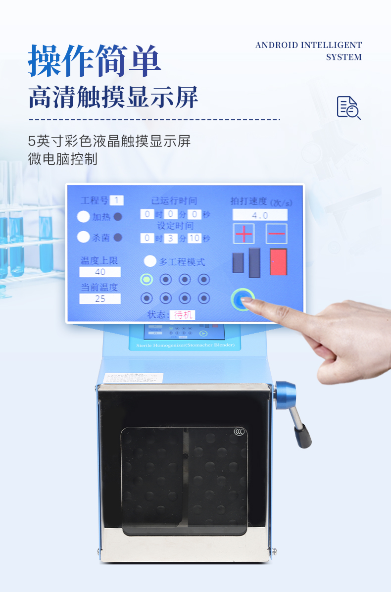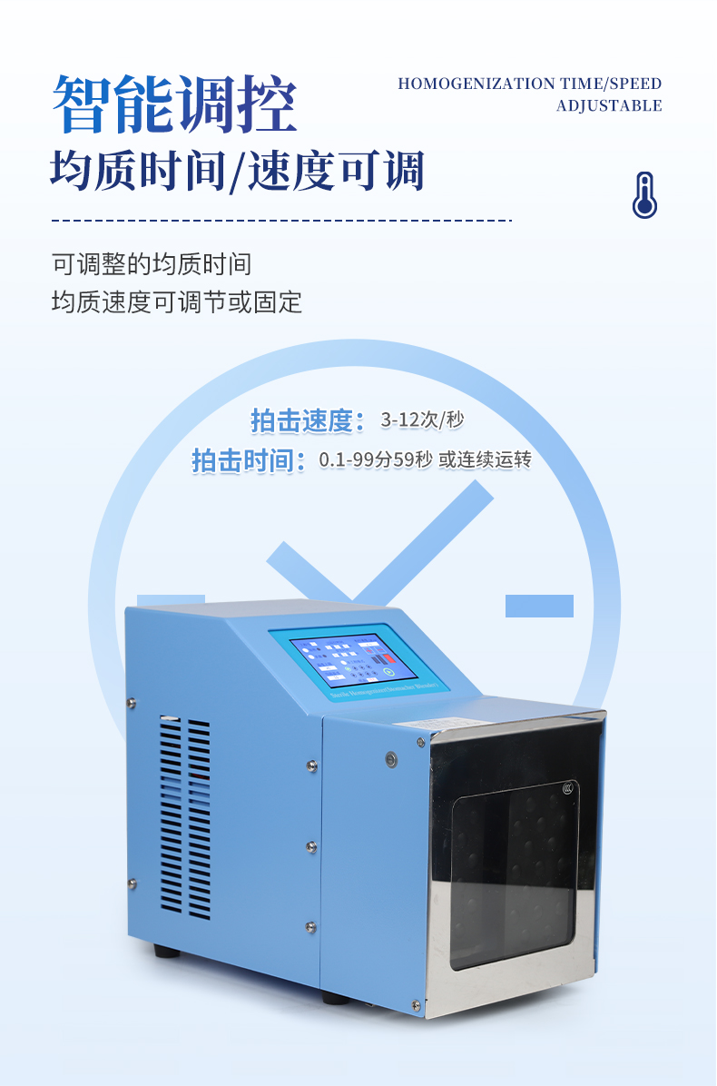●5英寸液晶顯示屏。    ●可儲存三組工作程序。    ●可調整的均質時間。    ●均質速度可調節或固定。    ●拍擊器可調整前后距離。    ●無菌一次性濾袋,保證衛生。    ●全開啟式門,易于清洗。    ●玻璃透明窗口易于觀察 。    ●樣品與均質儀無接觸,如無樣品泄露則不需進行系統清洗.    ●均質柔和、樣品零污染、無損傷、不升溫、不需要滅菌處理,不需洗刷器皿。