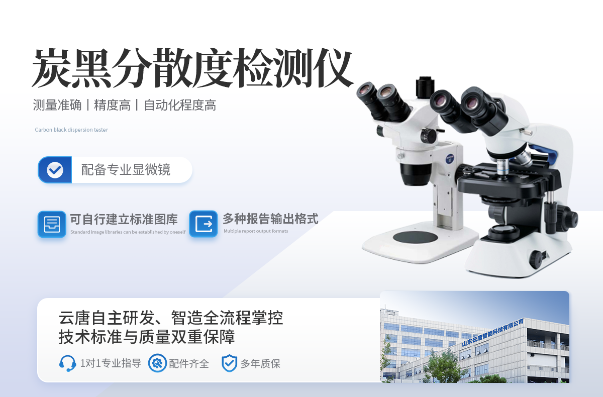 炭黑分散度檢測儀是根據國際標準GB/T 6030-2006 橡膠中炭黑和炭黑二氧化硅分散的評估 快速比較法的檢測儀器。該儀器適配軟件及相應的顯微鏡,通過對炭黑粒團的尺度、形態、及散布情況的測量,可以建立起這些參數與力學性能、抗靜電性能、吸濕性能等宏觀性能指標的內在聯系。對橡膠材料的品質保障、生產工藝、新品研發產生積極影響,同時推進企業和行業技術水平的快速提升。