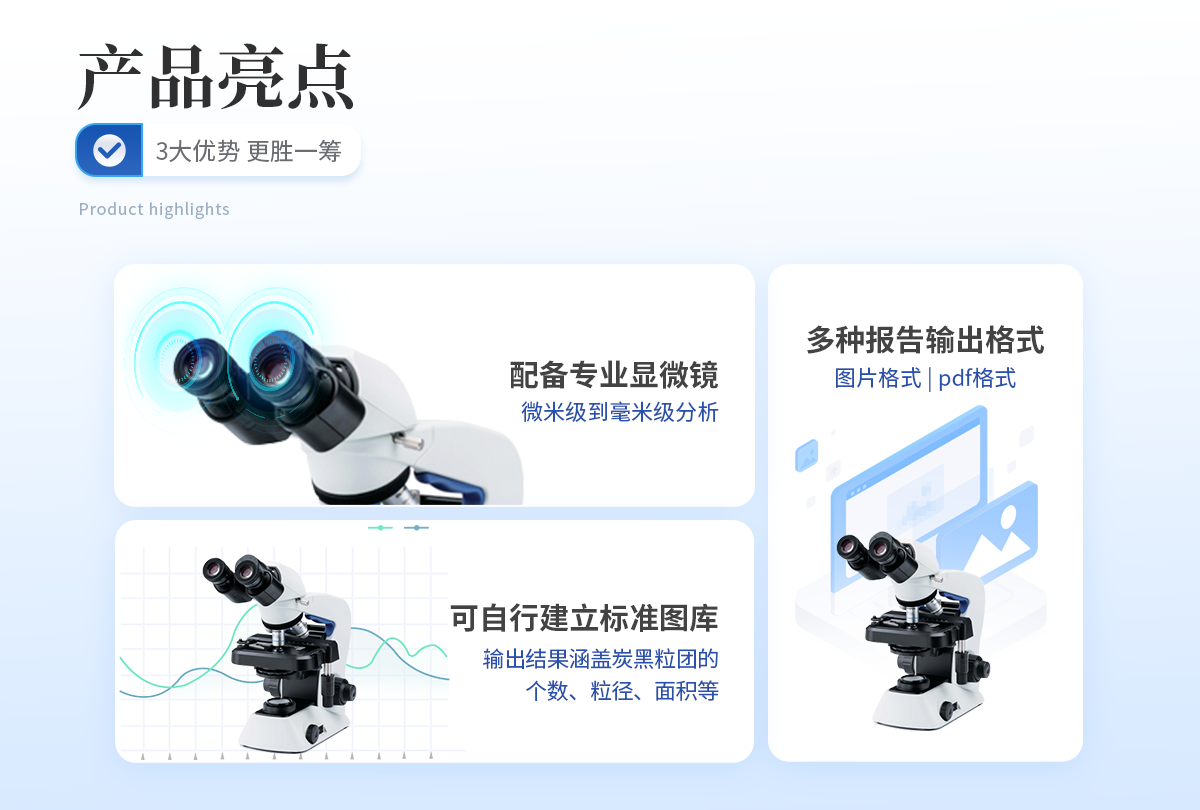 | 1. 采用專業圖像分析法由計算機完成炭黑分散度等級的判定,檢測精度高; | 2. 對目標炭黑粒徑可從微米級到毫米級進行分析; | 3. 配備專業顯微鏡,配以500萬CMOS圖像傳輸器; | 4. 可單張保存圖像,圖像大小由640*480,1024*768,1280*1024,2592*1944四種大小可供選擇; | 5. 豐富的圖像處理功能,滿足多種圖像處理需要; | 6. 軟件具有自動和手動兩種方式進行炭黑圖像分割; | 7. 軟件可滿足對局部分析的要求; | 8. 配備測微標尺,可進行像素點尺寸校準,并且軟件具有移動標尺功能,可進行任意兩點距離測量; | 9. 根據橡膠中炭黑種類,建立了由ISO提供的標準圖庫,以滿足客戶的目測對比需求; | 10. 客戶可以自行建立標準圖庫; | 11. 輸出結果涵蓋炭黑粒團的個數、粒徑、面積等,并可以數據報表和excel的形式進行輸出; | 12. 提供圖像灰階分布圖、粒子徑分布圖、粒度分布圖; | 13. 報告結果包括:樣品名、標準名、原始圖像、灰階圖等。報告輸出格式多樣,可以選擇圖片格式或pdf格式進行保存; | 14. 軟件試用各種主流操作系統,與win7/win10/winXP等有很好兼容性; | 15. 采用usb2.0數據接口,可適配多種采集設備(如:攝像頭或數碼相機)。 |