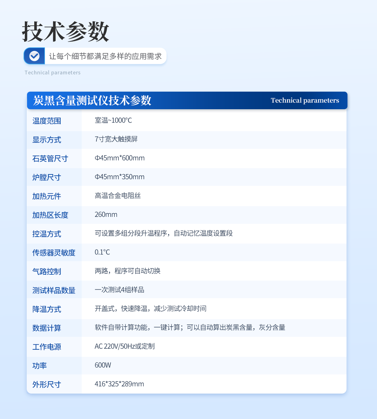 | 1.溫度范圍:室溫~1000℃ | 2. 顯示方式:7寸寬大觸摸屏 | 3.石英管尺寸:Ф45mm*600mm | 4. 爐膛尺寸:Φ45mm*350mm | 5.加熱元件:高溫合金電阻絲 | 6.加熱區長度:260mm | 7.控溫方式:可設置多組分段升溫程序,自動記憶溫度設置段 | 8. 傳感器靈敏度:0.1℃ | 9.氣路控制:兩路,程序可自動切換 | 10. 測試樣品數量:一次測試4組樣品 | 11.降溫方式:開蓋式,快速降溫,減少測試冷卻時間 | 12.數據計算:軟件自帶計算功能,一鍵計算;可以自動算出炭黑含量,灰分含量 | 13.工作電源 AC:220V/50Hz或定制 | 14.功率:600W | 15.外形尺寸:416*325*289mm |