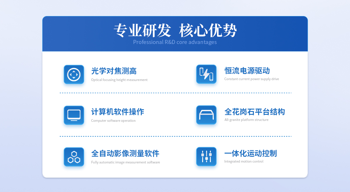 | 1. 本機專為**全自動量測市場量身定制,其具有的CNC編程、精準定位、重復測量、SPC報表統計、自動測量結果輸出等功能,能快速**地解決不同產品的批量測量需要,適用于以二維及簡易三維測量為目的的一切應用領域, 廣泛應用在鍋爐、壓力容器、航天、航空、電力、石油、化工、海洋石油、管道、軍工、船舶制造、汽車、機械制造、冶金、金屬加工業、鋼結構、鐵路交通、核能電力、高校等行業; | 2. 本機X、Y、Z三軸均為伺服驅動,由鼠標、鍵盤或選配搖桿操縱,通過本司專用的全自動影像測量軟件,具有自動邊緣提取、自動理匹、自動對焦、測量合成、影像合成等人工智能技術,同時,基于機器視覺與微米**控制下的自動對焦功能,可以滿足清晰攝影下輔助測高需要(亦可加入精密測頭完成接觸式坐標測高)。可在使用夾具或工件隨意放置的情況下,進行批量測量、SPC結果分類、自動輸出測量結果等操作。 |