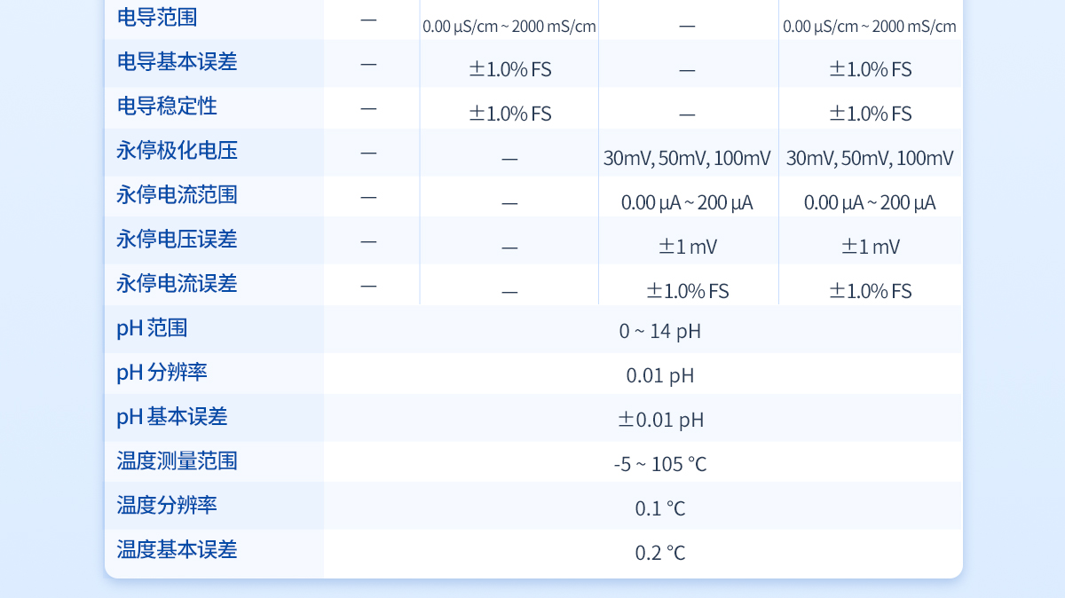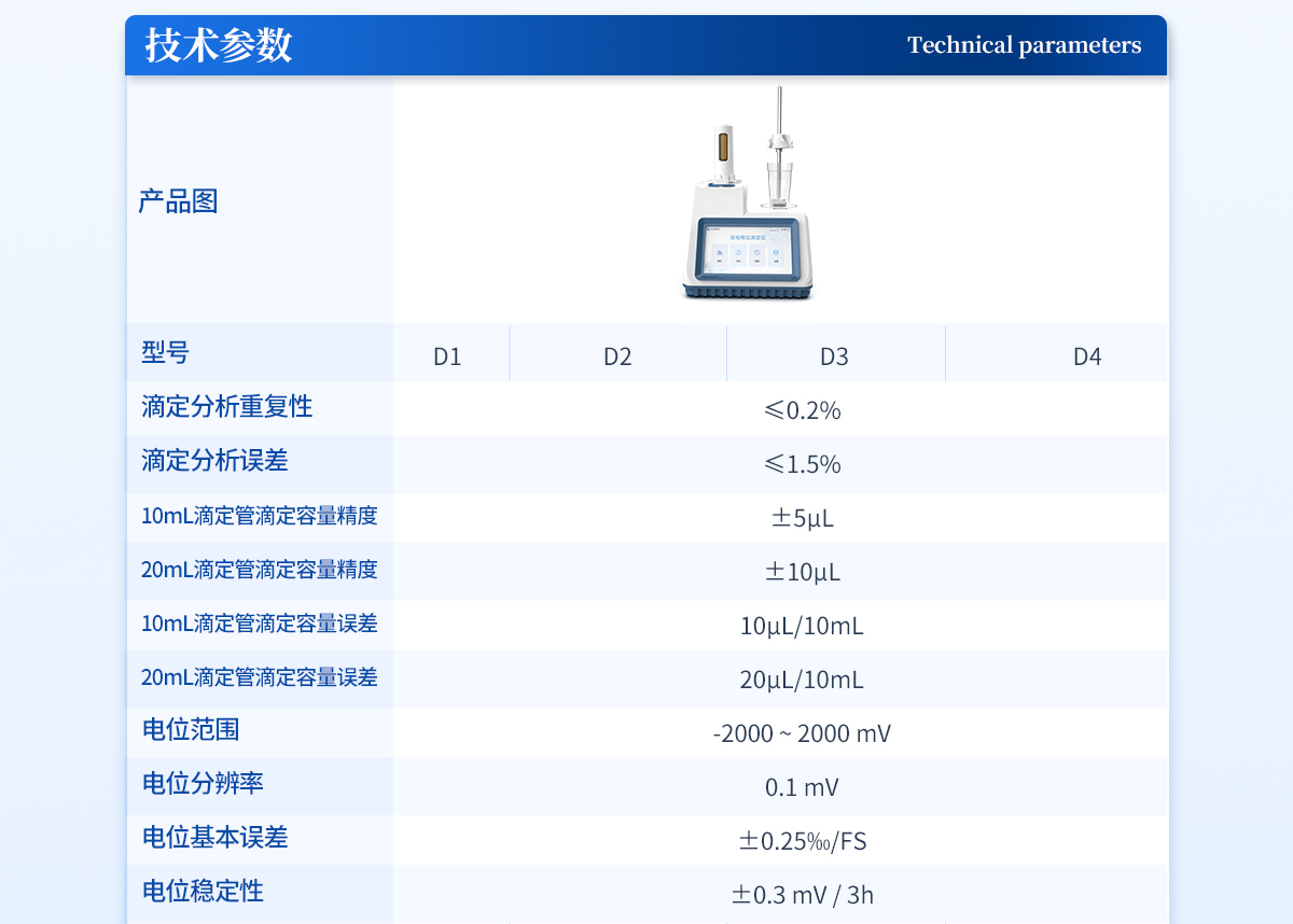 | 滴定分析重復性:≤0.2% | 滴定分析誤差:≤1.5% | 10mL滴定管滴定容量精度:±5μL | 20mL滴定管滴定容量精度:±10μL | 10mL滴定管滴定容量誤差:10μL/10mL | 20mL滴定管滴定容量誤差:20μL/10mL | 電位范圍:-2000—2000mV | 電位分辨率:0.1mV | 電位基本誤差mV:±0.25‰/FS | 電位穩定性mV:±0.3mV/3h | 電導范圍:0.00uS/cm-2000mS/cm | 電導基本誤差:±1.0% FS | 電導穩定性:±1.0% FS | pH范圍:0-14PH | pH分辨率:0.01PH | pH基本誤差:±0.01PH | 溫度測量范圍:-5 - 105℃ | 溫度分辨率:0.1℃ | 溫度基本誤差:0.2℃ |